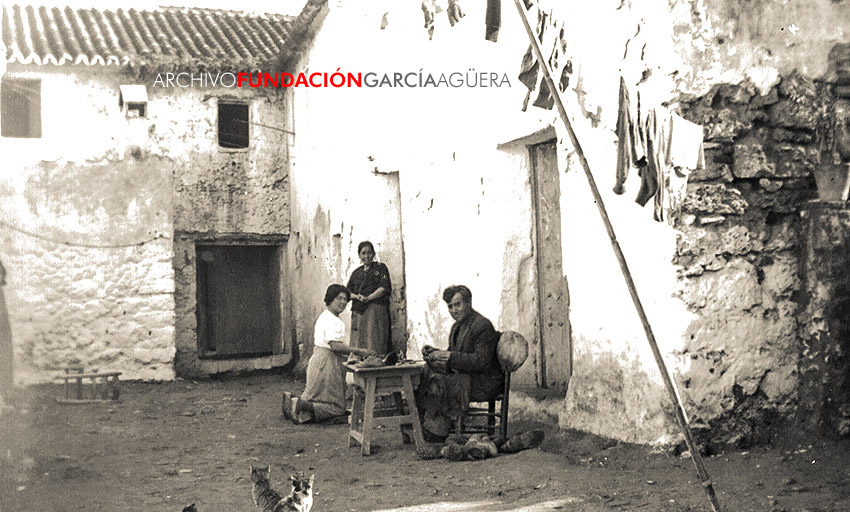 Zapatero trabajando en el patio de una de las casas de vecinos del Albaicín de Coín hacia 1955.