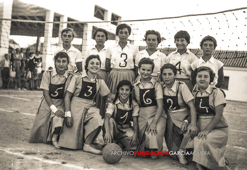 Pioneras muchachas coineñas en equipos de balonvolea durante una competición en la Feria de Agosto de Coín de 1955.