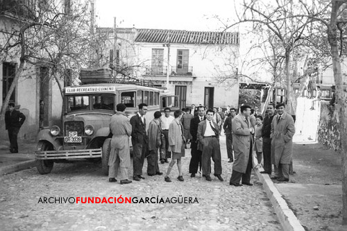 Llegada del autobús del Club Recreativo Coineño con jugadores, directivos y seguidores, al campo de fútbol del equipo de El Palo el domingo 23 de enero de 1955, al que ganó por 4 a 1.