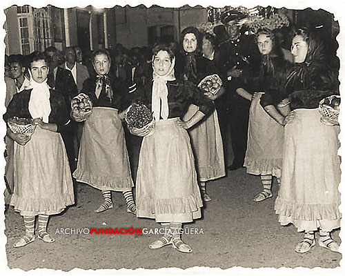 (1/2) Muchachas coineñas con el traje típico durante la procesión de la Virgen de la Fuensanta el 15 de agosto de 1955.